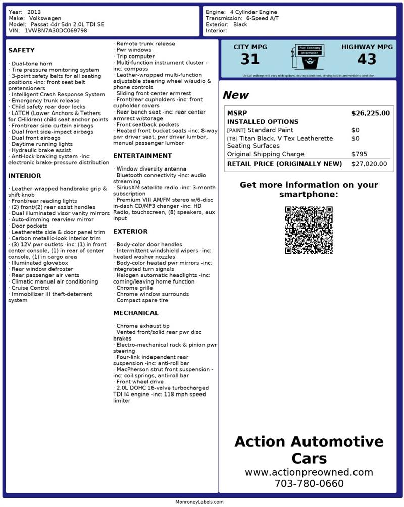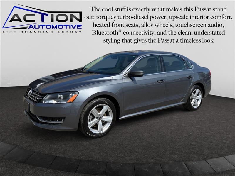 Visit Action Automotive Preowned Cars today and experience the comfort, efficiency, and turbo-diesel character of this impressive 2013 Volkswagen Passat TDI SE. 🚗 Get your next vehicle with ease! Action ships nationwide! Buy with confidence, with our ACTION JD POWER EDGE Certified Pre Owned limited Warranty! Every Action vehicle will include the ACTION JD POWER EDGE 3 months or 3,000 mile limited warranty. Extended warranty terms available thru Fidelity Warranty Services. YES We finance! Rate specials are available to well qualified buyers as well as 2nd chance our special Finance managers work in house to navigate any credit or buying situation. All vehicle prices exclude taxes, tags, fees, shipping upon request, and dealer-installed features such as LoJack or Ceramic Paint Protection. Our Dealer Processing fee is $999.00. Please see an Action dealer representative for complete details. We are available after hours via the internet, please submit a lead and we get to you right away.