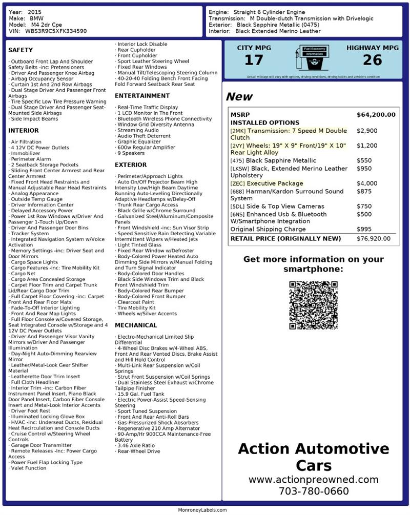 Visit Action Automotive Preowned Cars today and experience the power, precision, and thrill of this incredible 2015 BMW M4. 🚗🔥 Get your next vehicle with ease! Action ships nationwide! Buy with confidence, with our ACTION JD POWER EDGE Certified Pre Owned limited Warranty! Every Action vehicle will include the ACTION JD POWER EDGE 3 months or 3,000 mile limited warranty. Extended warranty terms available thru Fidelity Warranty Services. YES We finance! Rate specials are available to well qualified buyers as well as 2nd chance our special Finance managers work in house to navigate any credit or buying situation. All vehicle prices exclude taxes, tags, fees, shipping upon request, and dealer-installed features such as LoJack or Ceramic Paint Protection. Our Dealer Processing fee is $999.00. Please see an Action dealer representative for complete details. We are available after hours via the internet, please submit a lead and we get to you right away.