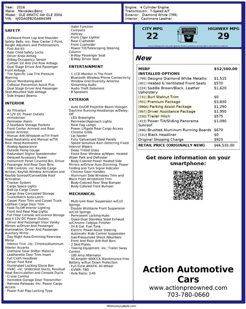 Visit Action Automotive Preowned Cars today and experience the refined efficiency, comfort, and engineering excellence of the 2016 Mercedes-Benz® GLE 300d—a luxury diesel SUV built to go farther with confidence and style. Get your next vehicle with ease! Action ships nationwide! Buy with confidence, with our ACTION JD POWER EDGE Certified Pre Owned limited Warranty! Every Action vehicle will include the ACTION JD POWER EDGE 3 months or 3,000 mile limited warranty. Extended warranty terms available thru Fidelity Warranty Services. YES We finance! Rate specials are available to well qualified buyers as well as 2nd chance our special Finance managers work in house to navigate any credit or buying situation. All vehicle prices exclude taxes, tags, fees, shipping upon request, and dealer-installed features such as LoJack or Ceramic Paint Protection. Our Dealer Processing fee is $999.00. Please see an Action dealer representative for complete details. We are available after hours via the internet, please submit a lead and we get to you right away.
