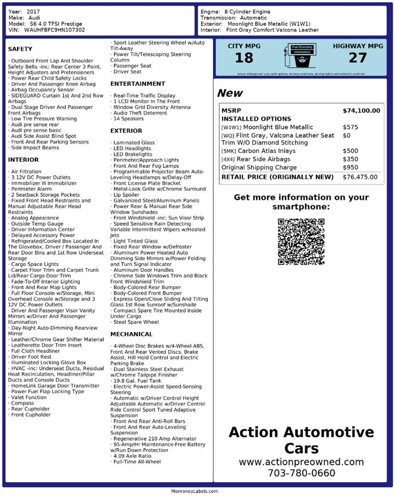 Visit us today at Action Automotive Preowned Cars and experience the power, precision, and prestige of the 2017 Audi® S6 Prestige—where V8 performance meets executive sophistication. Get your next vehicle with ease! Action ships nationwide! Buy with confidence, with our ACTION JD POWER EDGE Certified Pre Owned limited Warranty! Every Action vehicle will include the ACTION JD POWER EDGE 3 months or 3,000 mile limited warranty. Extended warranty terms available thru Fidelity Warranty Services. YES We finance! Rate specials are available to well qualified buyers as well as 2nd chance our special Finance managers work in house to navigate any credit or buying situation. All vehicle prices exclude taxes, tags, fees, shipping upon request, and dealer-installed features such as LoJack or Ceramic Paint Protection. Our Dealer Processing fee is $999.00. Please see an Action dealer representative for complete details. We are available after hours via the internet, please submit a lead and we get to you right away.