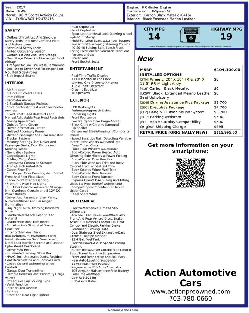 Visit Action Automotive Preowned Cars today and experience the power, luxury, and unmistakable M performance of this incredible 2017 BMW X6 M. 🚗 Get your next vehicle with ease! Action ships nationwide! Buy with confidence, with our ACTION JD POWER EDGE Certified Pre Owned limited Warranty! Every Action vehicle will include the ACTION JD POWER EDGE 3 months or 3,000 mile limited warranty. Extended warranty terms available thru Fidelity Warranty Services. YES We finance! Rate specials are available to well qualified buyers as well as 2nd chance our special Finance managers work in house to navigate any credit or buying situation. All vehicle prices exclude taxes, tags, fees, shipping upon request, and dealer-installed features such as LoJack or Ceramic Paint Protection. Our Dealer Processing fee is $999.00. Please see an Action dealer representative for complete details. We are available after hours via the internet, please submit a lead and we get to you right away.