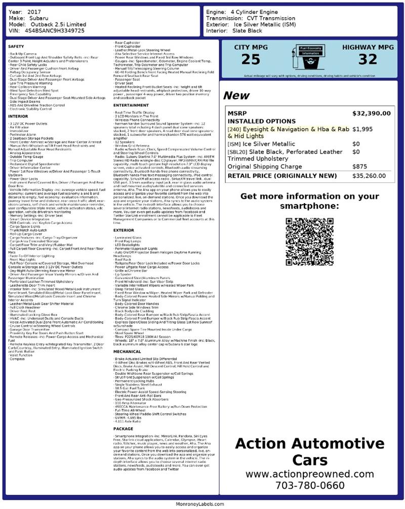 Visit us today at Action Automotive Preowned Cars and take this 2017 Subaru® Outback Limited for a test drive. Discover why it’s the perfect SUV for every journey—crafted to explore, built to last. Get your next vehicle with ease! Action ships nationwide! Buy with confidence, with our ACTION JD POWER EDGE Certified Pre Owned limited Warranty! Every Action vehicle will include the ACTION JD POWER EDGE 3 months or 3,000 mile limited warranty. Extended warranty terms available thru Fidelity Warranty Services. YES We finance! Rate specials are available to well qualified buyers as well as 2nd chance our special Finance managers work in house to navigate any credit or buying situation. All vehicle prices exclude taxes, tags, fees, shipping upon request, and dealer-installed features such as LoJack or Ceramic Paint Protection. Our Dealer Processing fee is $999.00. Please see an Action dealer representative for complete details. We are available after hours via the internet, please submit a lead and we get to you right away.