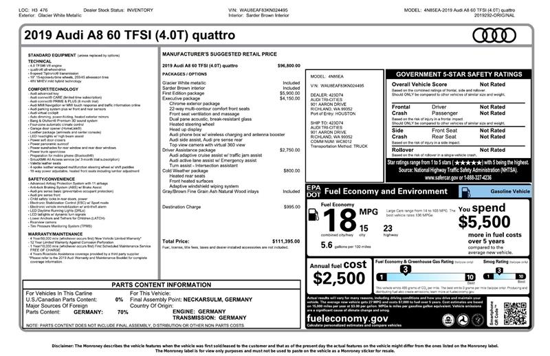 Visit us today at Action Automotive Preowned Cars and experience the prestige, power, and sophistication of the 2019 Audi® A8 L—where flagship luxury meets quattro® confidence. Get your next vehicle with ease! Action ships nationwide! Buy with confidence, with our ACTION JD POWER EDGE Certified Pre Owned limited Warranty! Every Action vehicle will include the ACTION JD POWER EDGE 3 months or 3,000 mile limited warranty. Extended warranty terms available thru Fidelity Warranty Services. YES We finance! Rate specials are available to well qualified buyers as well as 2nd chance our special Finance managers work in house to navigate any credit or buying situation. All vehicle prices exclude taxes, tags, fees, shipping upon request, and dealer-installed features such as LoJack or Ceramic Paint Protection. Our Dealer Processing fee is $999.00. Please see an Action dealer representative for complete details. We are available after hours via the internet, please submit a lead and we get to you right away.