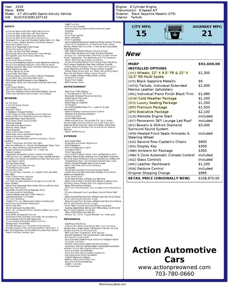Visit us today at Action Automotive Preowned Cars and experience the power, presence, and prestige of the 2019 BMW® X7 xDrive50i—where flagship luxury meets true performance. Get your next vehicle with ease! Action ships nationwide! Buy with confidence, with our ACTION JD POWER EDGE Certified Pre Owned limited Warranty! Every Action vehicle will include the ACTION JD POWER EDGE 3 months or 3,000 mile limited warranty. Extended warranty terms available thru Fidelity Warranty Services. YES We finance! Rate specials are available to well qualified buyers as well as 2nd chance our special Finance managers work in house to navigate any credit or buying situation. All vehicle prices exclude taxes, tags, fees, shipping upon request, and dealer-installed features such as LoJack or Ceramic Paint Protection. Our Dealer Processing fee is $999.00. Please see an Action dealer representative for complete details. We are available after hours via the internet, please submit a lead and we get to you right away.