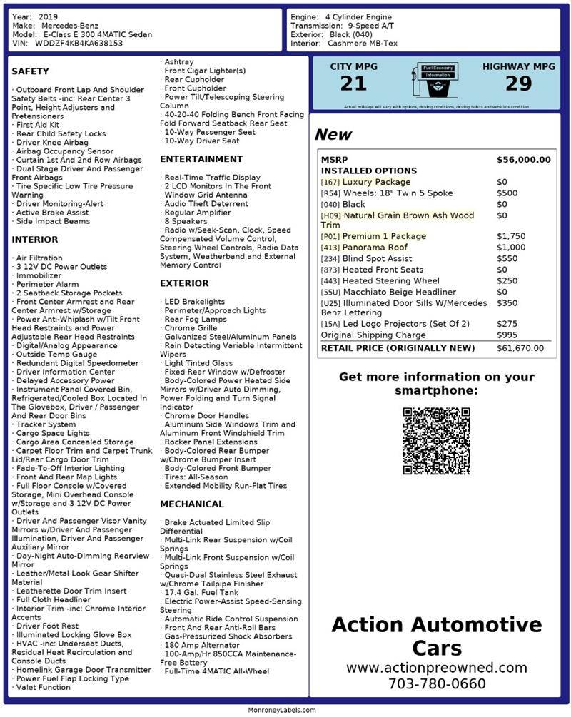 Come visit us today at Action Automotive Preowned Cars and take this 2019 Mercedes-Benz® E 300 for a test drive. Once you’re behind the wheel, you’ll understand why the E-Class® is considered the heart of the Mercedes-Benz® lineup. Get your next vehicle with ease! Action ships nationwide! Buy with confidence, with our ACTION JD POWER EDGE Certified Pre Owned limited Warranty! Every Action vehicle will include the ACTION JD POWER EDGE 3 months or 3,000 mile limited warranty. Extended warranty terms available thru Fidelity Warranty Services. YES We finance! Rate specials are available to well qualified buyers as well as 2nd chance our special Finance managers work in house to navigate any credit or buying situation. All vehicle prices exclude taxes, tags, fees, shipping upon request, and dealer-installed features such as LoJack or Ceramic Paint Protection. Our Dealer Processing fee is $999.00. Please see an Action dealer representative for complete details. We are available after hours via the internet, please submit a lead and we get to you right away.