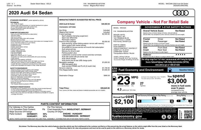 2020 Audi® S4 Premium Plus – Ibis White – 3.0L TFSI® Twin-Scroll Turbo DOHC V6 – quattro® All-Wheel Drive – 33,537 Miles