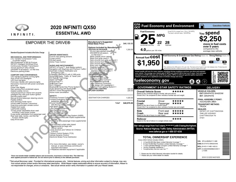 Come visit us today at Action Automotive Preowned Cars and take this 2020 INFINITI® QX50 Essential for a test drive. Once you’re behind the wheel, you’ll see why it redefines what a luxury crossover can be. Get your next vehicle with ease! Action ships nationwide! Buy with confidence, with our ACTION JD POWER EDGE Certified Pre Owned limited Warranty! Every Action vehicle will include the ACTION JD POWER EDGE 3 months or 3,000 mile limited warranty. Extended warranty terms available thru Fidelity Warranty Services. YES We finance! Rate specials are available to well qualified buyers as well as 2nd chance our special Finance managers work in house to navigate any credit or buying situation. All vehicle prices exclude taxes, tags, fees, shipping upon request, and dealer-installed features such as LoJack or Ceramic Paint Protection. Our Dealer Processing fee is $999.00. Please see an Action dealer representative for complete details. We are available after hours via the internet, please submit a lead and we get to you right away.