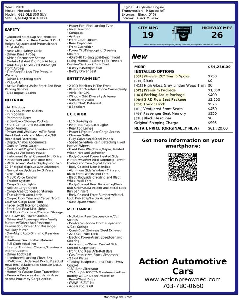Visit Action Automotive Preowned Cars today and experience the comfort, elegance, and advanced technology of this outstanding 2020 Mercedes-Benz GLE 350. 🚙 Get your next vehicle with ease! Action ships nationwide! Buy with confidence, with our ACTION JD POWER EDGE Certified Pre Owned limited Warranty! Every Action vehicle will include the ACTION JD POWER EDGE 3 months or 3,000 mile limited warranty. Extended warranty terms available thru Fidelity Warranty Services. YES We finance! Rate specials are available to well qualified buyers as well as 2nd chance our special Finance managers work in house to navigate any credit or buying situation. All vehicle prices exclude taxes, tags, fees, shipping upon request, and dealer-installed features such as LoJack or Ceramic Paint Protection. Our Dealer Processing fee is $999.00. Please see an Action dealer representative for complete details. We are available after hours via the internet, please submit a lead and we get to you right away.