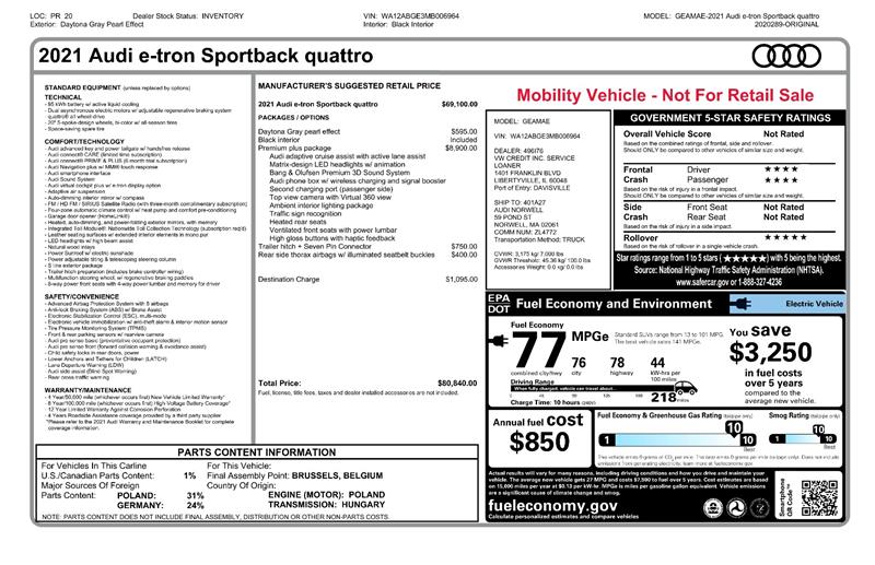 2021 Audi® e-tron® Sportback Premium Plus quattro® – Daytona Gray Pearl Effect – Dual Asynchronous Electric Motors with 95 kWh Battery – All-Wheel Drive – 36,500 Miles