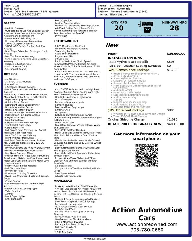 The 2021 Audi Q3 S line Premium is here — only at Action Automotive Preowned Cars. Get your next vehicle with ease! Action ships nationwide! Buy with confidence, with our ACTION JD POWER EDGE Certified Pre Owned limited Warranty! Every Action vehicle will include the ACTION JD POWER EDGE 3 months or 3,000 mile limited warranty. Extended warranty terms available thru Fidelity Warranty Services. YES We finance! Rate specials are available to well qualified buyers as well as 2nd chance our special Finance managers work in house to navigate any credit or buying situation. All vehicle prices exclude taxes, tags, fees, shipping upon request, and dealer-installed features such as LoJack or Ceramic Paint Protection. Our Dealer Processing fee is $999.00. Please see an Action dealer representative for complete details. We are available after hours via the internet, please submit a lead and we get to you right away.