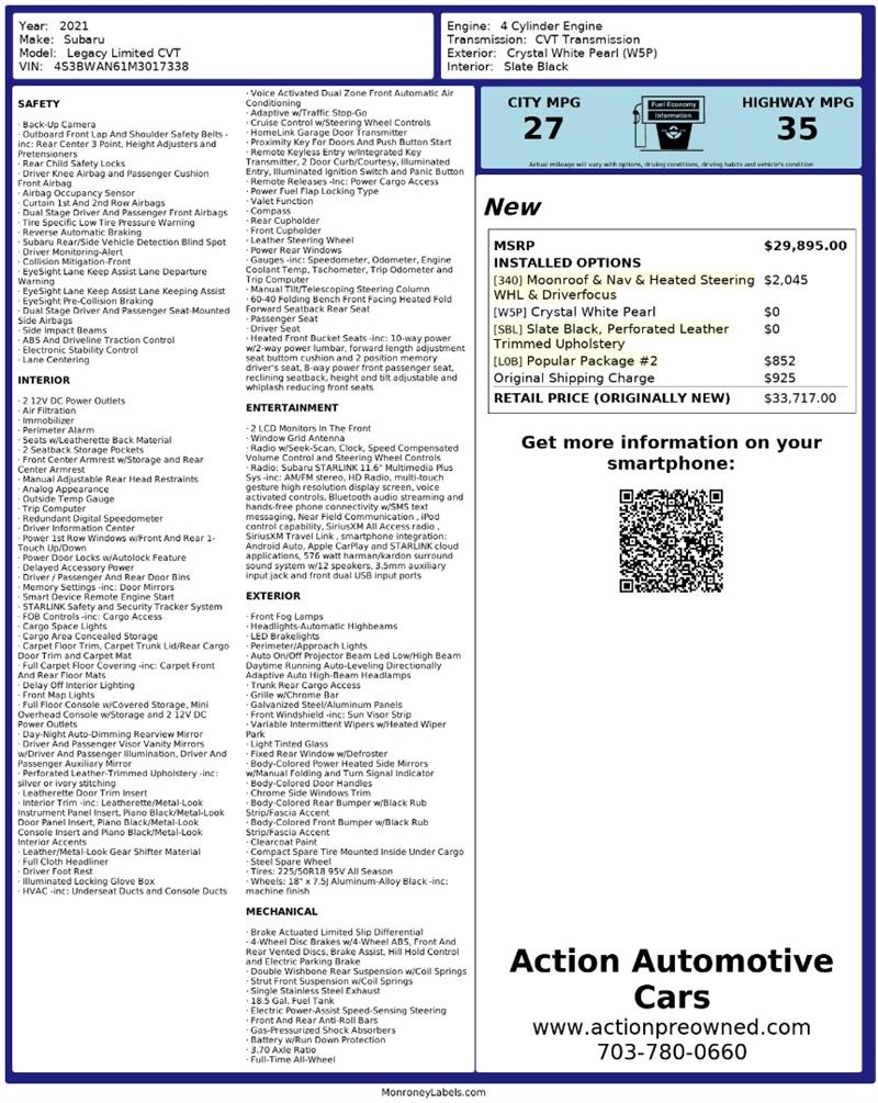 Visit us today at Action Automotive Preowned Cars and experience this 2021 Subaru® Legacy Limited for yourself. Once you get behind the wheel, you’ll see why it’s a sedan that inspires confidence mile after mile. Get your next vehicle with ease! Action ships nationwide! Buy with confidence, with our ACTION JD POWER EDGE Certified Pre Owned limited Warranty! Every Action vehicle will include the ACTION JD POWER EDGE 3 months or 3,000 mile limited warranty. Extended warranty terms available thru Fidelity Warranty Services. YES We finance! Rate specials are available to well qualified buyers as well as 2nd chance our special Finance managers work in house to navigate any credit or buying situation. All vehicle prices exclude taxes, tags, fees, shipping upon request, and dealer-installed features such as LoJack or Ceramic Paint Protection. Our Dealer Processing fee is $999.00. Please see an Action dealer representative for complete details. We are available after hours via the internet, please submit a lead and we get to you right away.