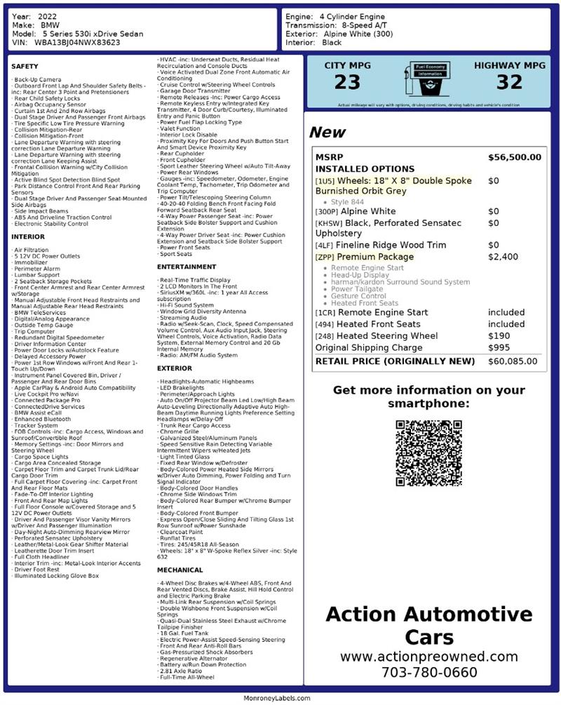 Come visit us today at Action Automotive Preowned Cars and experience the 2022 BMW® 530i xDrive for yourself. Once you get behind the wheel, you’ll see why the 5 Series remains the benchmark for luxury sedans. Get your next vehicle with ease! Action ships nationwide! Buy with confidence, with our ACTION JD POWER EDGE Certified Pre Owned limited Warranty! Every Action vehicle will include the ACTION JD POWER EDGE 3 months or 3,000 mile limited warranty. Extended warranty terms available thru Fidelity Warranty Services. YES We finance! Rate specials are available to well qualified buyers as well as 2nd chance our special Finance managers work in house to navigate any credit or buying situation. All vehicle prices exclude taxes, tags, fees, shipping upon request, and dealer-installed features such as LoJack or Ceramic Paint Protection. Our Dealer Processing fee is $999.00. Please see an Action dealer representative for complete details. We are available after hours via the internet, please submit a lead and we get to you right away.
