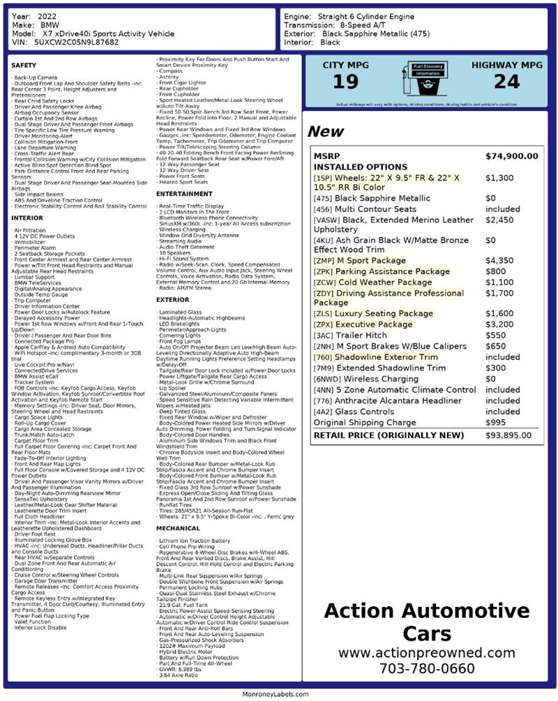Visit us today at Action Automotive Preowned Cars and experience the sophistication, power, and presence of the 2022 BMW® X7 xDrive40i—where flagship luxury meets BMW performance. Get your next vehicle with ease! Action ships nationwide! Buy with confidence, with our ACTION JD POWER EDGE Certified Pre Owned limited Warranty! Every Action vehicle will include the ACTION JD POWER EDGE 3 months or 3,000 mile limited warranty. Extended warranty terms available thru Fidelity Warranty Services. YES We finance! Rate specials are available to well qualified buyers as well as 2nd chance our special Finance managers work in house to navigate any credit or buying situation. All vehicle prices exclude taxes, tags, fees, shipping upon request, and dealer-installed features such as LoJack or Ceramic Paint Protection. Our Dealer Processing fee is $999.00. Please see an Action dealer representative for complete details. We are available after hours via the internet, please submit a lead and we get to you right away.