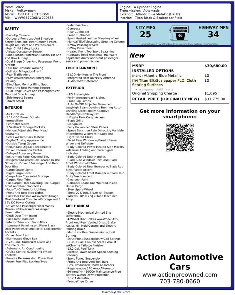 Visit us today at Action Automotive Preowned Cars and take the 2022 Volkswagen® Golf GTI S for a drive. Once you get behind the wheel, you’ll understand why it’s the hot hatch benchmark. Get your next vehicle with ease! Action ships nationwide! Buy with confidence, with our ACTION JD POWER EDGE Certified Pre Owned limited Warranty! Every Action vehicle will include the ACTION JD POWER EDGE 3 months or 3,000 mile limited warranty. Extended warranty terms available thru Fidelity Warranty Services. YES We finance! Rate specials are available to well qualified buyers as well as 2nd chance our special Finance managers work in house to navigate any credit or buying situation. All vehicle prices exclude taxes, tags, fees, shipping upon request, and dealer-installed features such as LoJack or Ceramic Paint Protection. Our Dealer Processing fee is $999.00. Please see an Action dealer representative for complete details. We are available after hours via the internet, please submit a lead and we get to you right away.