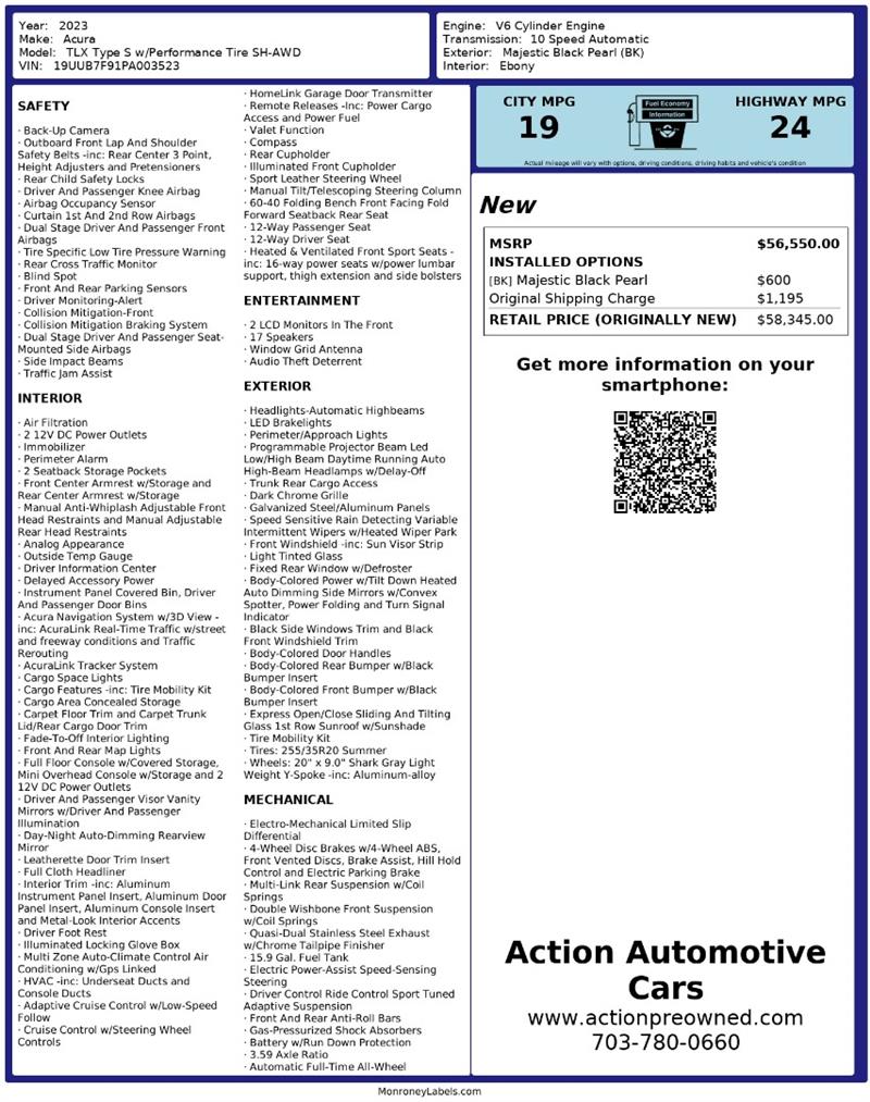 Visit Action Automotive Preowned Cars today and experience the power, precision, and luxury of this incredible 2023 Acura TLX Type S. 🚗🔥 Get your next vehicle with ease! Action ships nationwide! Buy with confidence, with our ACTION JD POWER EDGE Certified Pre Owned limited Warranty! Every Action vehicle will include the ACTION JD POWER EDGE 3 months or 3,000 mile limited warranty. Extended warranty terms available thru Fidelity Warranty Services. YES We finance! Rate specials are available to well qualified buyers as well as 2nd chance our special Finance managers work in house to navigate any credit or buying situation. All vehicle prices exclude taxes, tags, fees, shipping upon request, and dealer-installed features such as LoJack or Ceramic Paint Protection. Our Dealer Processing fee is $999.00. Please see an Action dealer representative for complete details. We are available after hours via the internet, please submit a lead and we get to you right away.