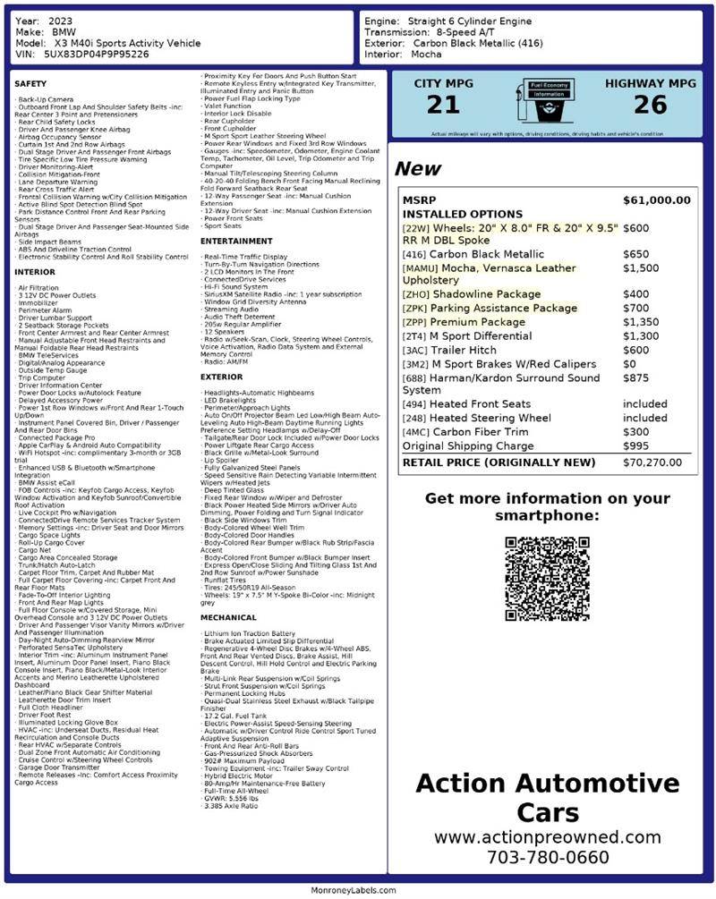 Visit us today at Action Automotive Preowned Cars and experience the power, precision, and everyday versatility of the 2023 BMW® X3 M40i—where M performance meets real-world luxury. Get your next vehicle with ease! Action ships nationwide! Buy with confidence, with our ACTION JD POWER EDGE Certified Pre Owned limited Warranty! Every Action vehicle will include the ACTION JD POWER EDGE 3 months or 3,000 mile limited warranty. Extended warranty terms available thru Fidelity Warranty Services. YES We finance! Rate specials are available to well qualified buyers as well as 2nd chance our special Finance managers work in house to navigate any credit or buying situation. All vehicle prices exclude taxes, tags, fees, shipping upon request, and dealer-installed features such as LoJack or Ceramic Paint Protection. Our Dealer Processing fee is $999.00. Please see an Action dealer representative for complete details. We are available after hours via the internet, please submit a lead and we get to you right away.