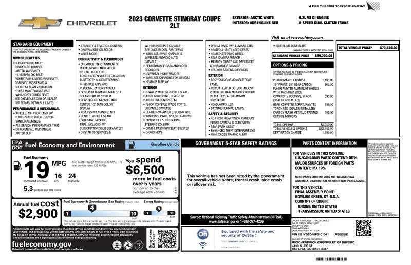 2023 Chevrolet Corvette Stingray 2LT – Arctic White – 6.2L V8 DI High-Output with Variable Valve Timing – Rear-Wheel Drive – 3,416 Miles