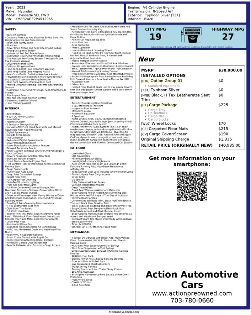 Smart, spacious, and stylish — the 2023 Hyundai Palisade SEL is everything your family needs, and it’s here now at Action Automotive Preowned Cars. Get your next vehicle with ease! Action ships nationwide! Buy with confidence, with our ACTION JD POWER EDGE Certified Pre Owned limited Warranty! Every Action vehicle will include the ACTION JD POWER EDGE 3 months or 3,000 mile limited warranty. Extended warranty terms available thru Fidelity Warranty Services. YES We finance! Rate specials are available to well qualified buyers as well as 2nd chance our special Finance managers work in house to navigate any credit or buying situation. All vehicle prices exclude taxes, tags, fees, shipping upon request, and dealer-installed features such as LoJack or Ceramic Paint Protection. Our Dealer Processing fee is $999.00. Please see an Action dealer representative for complete details. We are available after hours via the internet, please submit a lead and we get to you right away.