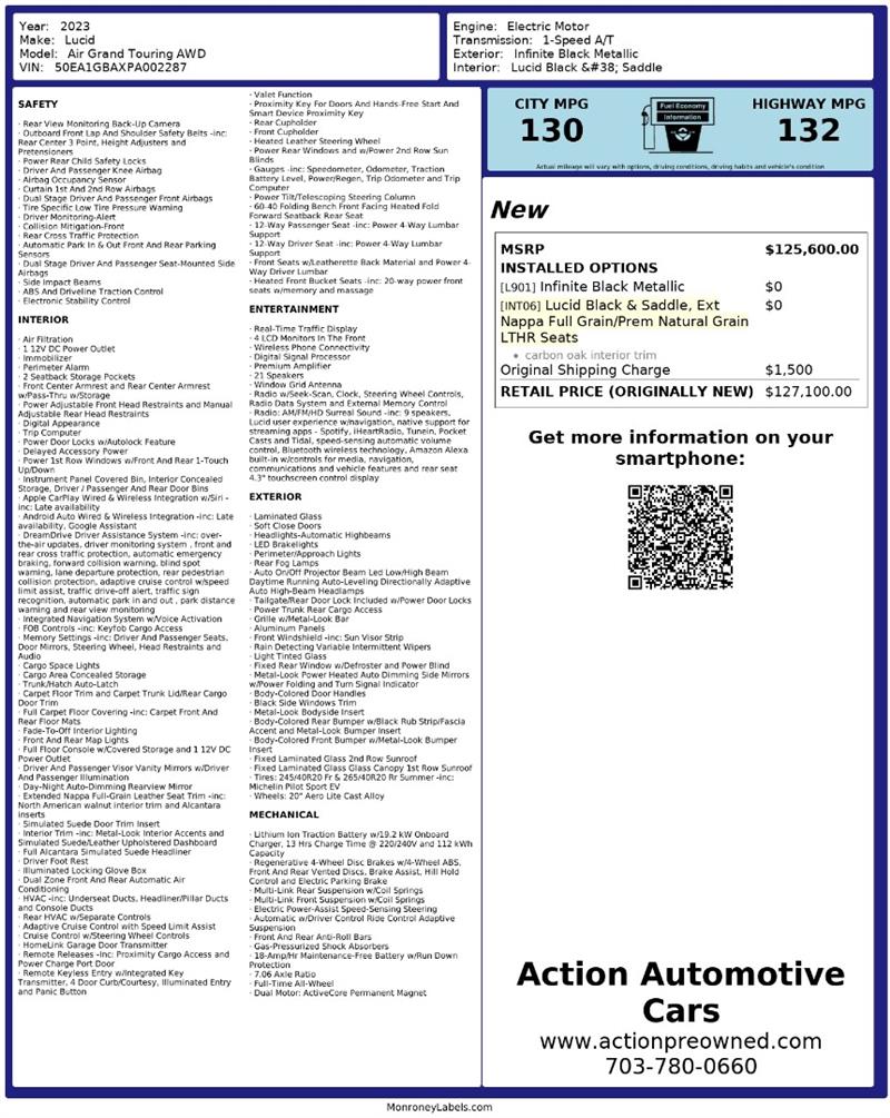 Visit us today at Action Automotive Preowned Cars and experience the unforgettable Lucid® Air Grand Touring—where electric elegance meets raw power, and every drive feels extraordinary. Get your next vehicle with ease! Action ships nationwide! Buy with confidence, with our ACTION JD POWER EDGE Certified Pre Owned limited Warranty! Every Action vehicle will include the ACTION JD POWER EDGE 3 months or 3,000 mile limited warranty. Extended warranty terms available thru Fidelity Warranty Services. YES We finance! Rate specials are available to well qualified buyers as well as 2nd chance our special Finance managers work in house to navigate any credit or buying situation. All vehicle prices exclude taxes, tags, fees, shipping upon request, and dealer-installed features such as LoJack or Ceramic Paint Protection. Our Dealer Processing fee is $999.00. Please see an Action dealer representative for complete details. We are available after hours via the internet, please submit a lead and we get to you right away.