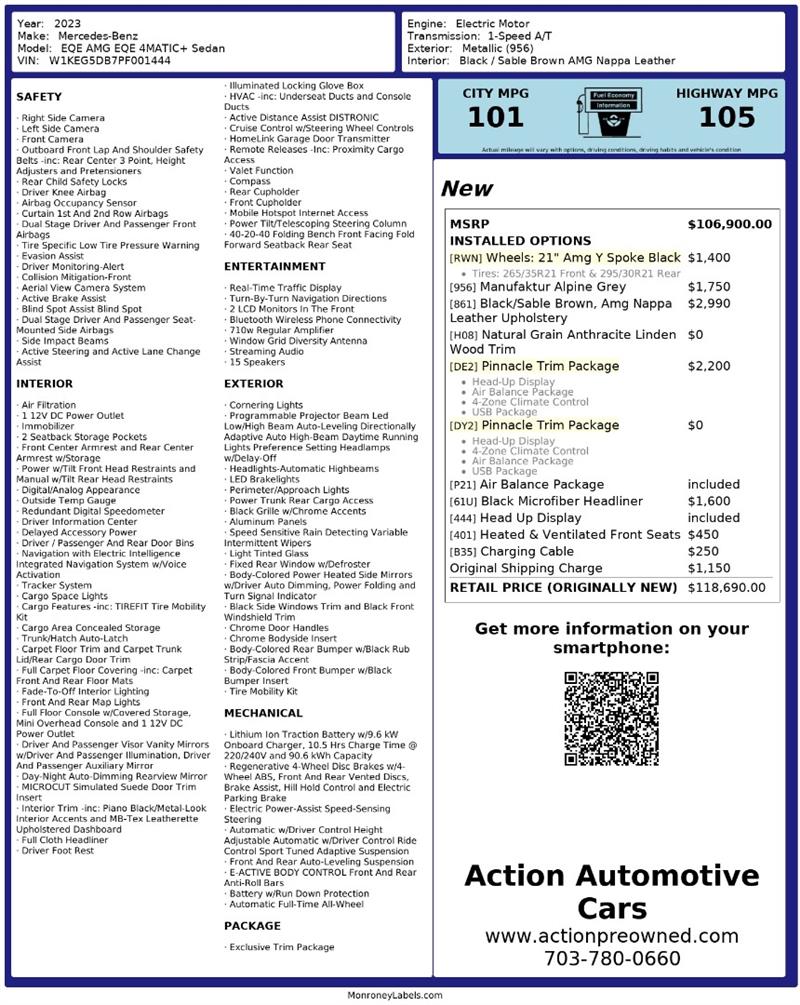 Visit Action Automotive Preowned Cars today and experience the electrifying performance, innovative technology, and refined luxury of this exceptional 2023 Mercedes-Benz AMG® EQE. Get your next vehicle with ease! Action ships nationwide! Buy with confidence, with our ACTION JD POWER EDGE Certified Pre Owned limited Warranty! Every Action vehicle will include the ACTION JD POWER EDGE 3 months or 3,000 mile limited warranty. Extended warranty terms available thru Fidelity Warranty Services. YES We finance! Rate specials are available to well qualified buyers as well as 2nd chance our special Finance managers work in house to navigate any credit or buying situation. All vehicle prices exclude taxes, tags, fees, shipping upon request, and dealer-installed features such as LoJack or Ceramic Paint Protection. Our Dealer Processing fee is $999.00. Please see an Action dealer representative for complete details. We are available after hours via the internet, please submit a lead and we get to you right away.