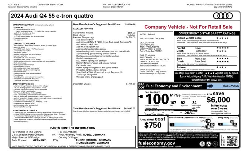 The 2024 Audi Q4 e-tron Premium Plus is waiting — only at Action Automotive Preowned Cars. Get your next vehicle with ease! Action ships nationwide! Buy with confidence, with our ACTION JD POWER EDGE Certified Pre Owned limited Warranty! Every Action vehicle will include the ACTION JD POWER EDGE 3 months or 3,000 mile limited warranty. Extended warranty terms available thru Fidelity Warranty Services. YES We finance! Rate specials are available to well qualified buyers as well as 2nd chance our special Finance managers work in house to navigate any credit or buying situation. All vehicle prices exclude taxes, tags, fees, shipping upon request, and dealer-installed features such as LoJack or Ceramic Paint Protection. Our Dealer Processing fee is $999.00. Please see an Action dealer representative for complete details. We are available after hours via the internet, please submit a lead and we get to you right away.