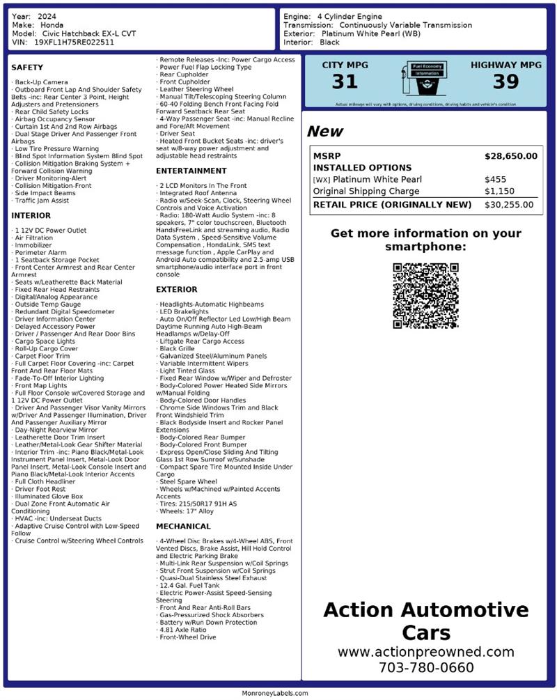 Visit us today at Action Automotive Preowned Cars to experience this 2024 Honda® Civic EX-L. Once you get behind the wheel, you’ll see why it remains the standard for sporty, stylish, and smart sedans. Get your next vehicle with ease! Action ships nationwide! Buy with confidence, with our ACTION JD POWER EDGE Certified Pre Owned limited Warranty! Every Action vehicle will include the ACTION JD POWER EDGE 3 months or 3,000 mile limited warranty. Extended warranty terms available thru Fidelity Warranty Services. YES We finance! Rate specials are available to well qualified buyers as well as 2nd chance our special Finance managers work in house to navigate any credit or buying situation. All vehicle prices exclude taxes, tags, fees, shipping upon request, and dealer-installed features such as LoJack or Ceramic Paint Protection. Our Dealer Processing fee is $999.00. Please see an Action dealer representative for complete details. We are available after hours via the internet, please submit a lead and we get to you right away.