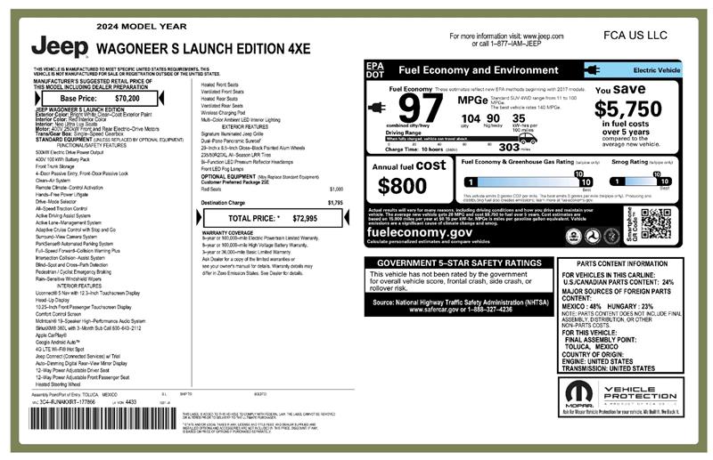 When it comes to smartphone integration, this 2024 Jeep Wagoneer S Launch Edition includes both wireless Apple CarPlay® and wireless Android Auto™, giving you seamless access to maps, music, calls, and your favorite apps while on the go. Those features are listed as standard on Launch Edition specs and fit perfectly with the high-tech personality of this all-electric SUV.