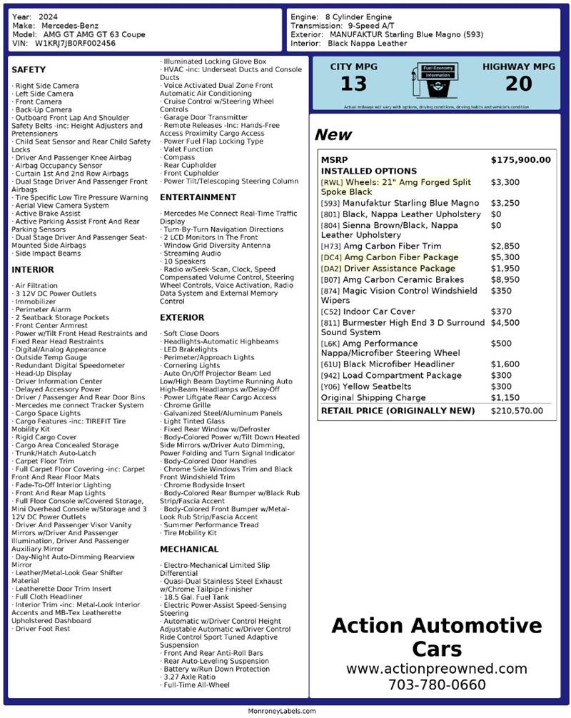 The 2024 Mercedes-Benz AMG GT 63 is waiting — only at Action Automotive Preowned Cars. Get your next vehicle with ease! Action ships nationwide! Buy with confidence, with our ACTION JD POWER EDGE Certified Pre Owned limited Warranty! Every Action vehicle will include the ACTION JD POWER EDGE 3 months or 3,000 mile limited warranty. Extended warranty terms available thru Fidelity Warranty Services. YES We finance! Rate specials are available to well qualified buyers as well as 2nd chance our special Finance managers work in house to navigate any credit or buying situation. All vehicle prices exclude taxes, tags, fees, shipping upon request, and dealer-installed features such as LoJack or Ceramic Paint Protection. Our Dealer Processing fee is $999.00. Please see an Action dealer representative for complete details. We are available after hours via the internet, please submit a lead and we get to you right away.