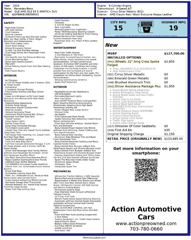 Visit Action Automotive Preowned Cars today and experience the incredible power, advanced technology, and refined luxury of this extraordinary 2024 Mercedes-Benz AMG® GLE 63 S. Get your next vehicle with ease! Action ships nationwide! Buy with confidence, with our ACTION JD POWER EDGE Certified Pre Owned limited Warranty! Every Action vehicle will include the ACTION JD POWER EDGE 3 months or 3,000 mile limited warranty. Extended warranty terms available thru Fidelity Warranty Services. YES We finance! Rate specials are available to well qualified buyers as well as 2nd chance our special Finance managers work in house to navigate any credit or buying situation. All vehicle prices exclude taxes, tags, fees, shipping upon request, and dealer-installed features such as LoJack or Ceramic Paint Protection. Our Dealer Processing fee is $999.00. Please see an Action dealer representative for complete details. We are available after hours via the internet, please submit a lead and we get to you right away.