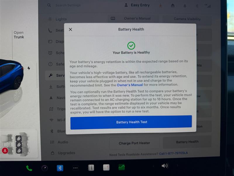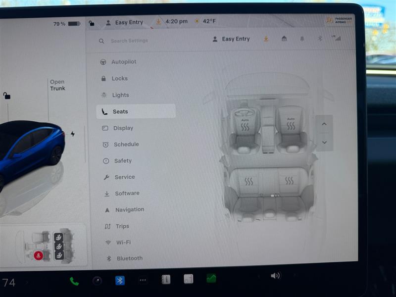 The exterior design is clean, aerodynamic, and unmistakably Tesla. Sculpted body lines, flush door handles, sleek LED lighting, and a panoramic glass roof give the Model 3 a futuristic presence on the road. The rich Deep Blue Metallic paint highlights the vehicle’s elegant shape while adding a sophisticated and sporty appearance that stands out wherever it goes.